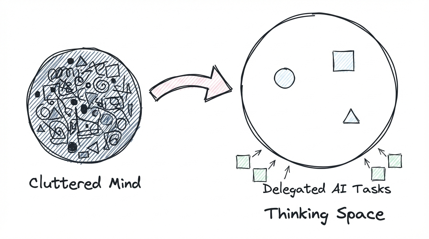 Why is this possible now? AI can do the implementation work that I usually had to speed up to get done. I can pass it on. “You do the implementation, I’ll check the results, we’ll see if it works out.” That gives me the space to step back and think more.