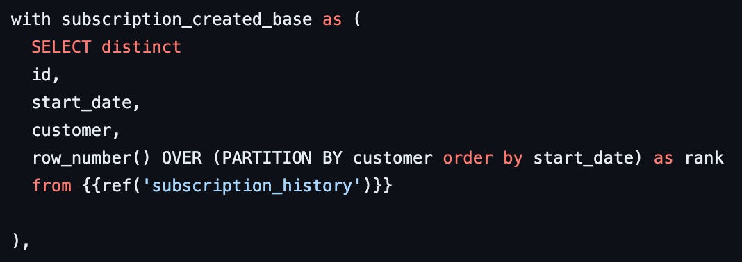 Here, we get the information from the history table that is relevant for us, and we build a row number rank because we are just interested in the first instances of all subscriptions.