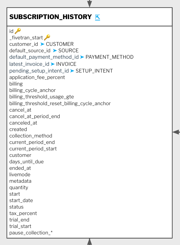 Fivetran, for example, uses history tables for some integrations. History tables are a great start to finding event data since they materialize the activities’ results. Here we have a subscription history table: