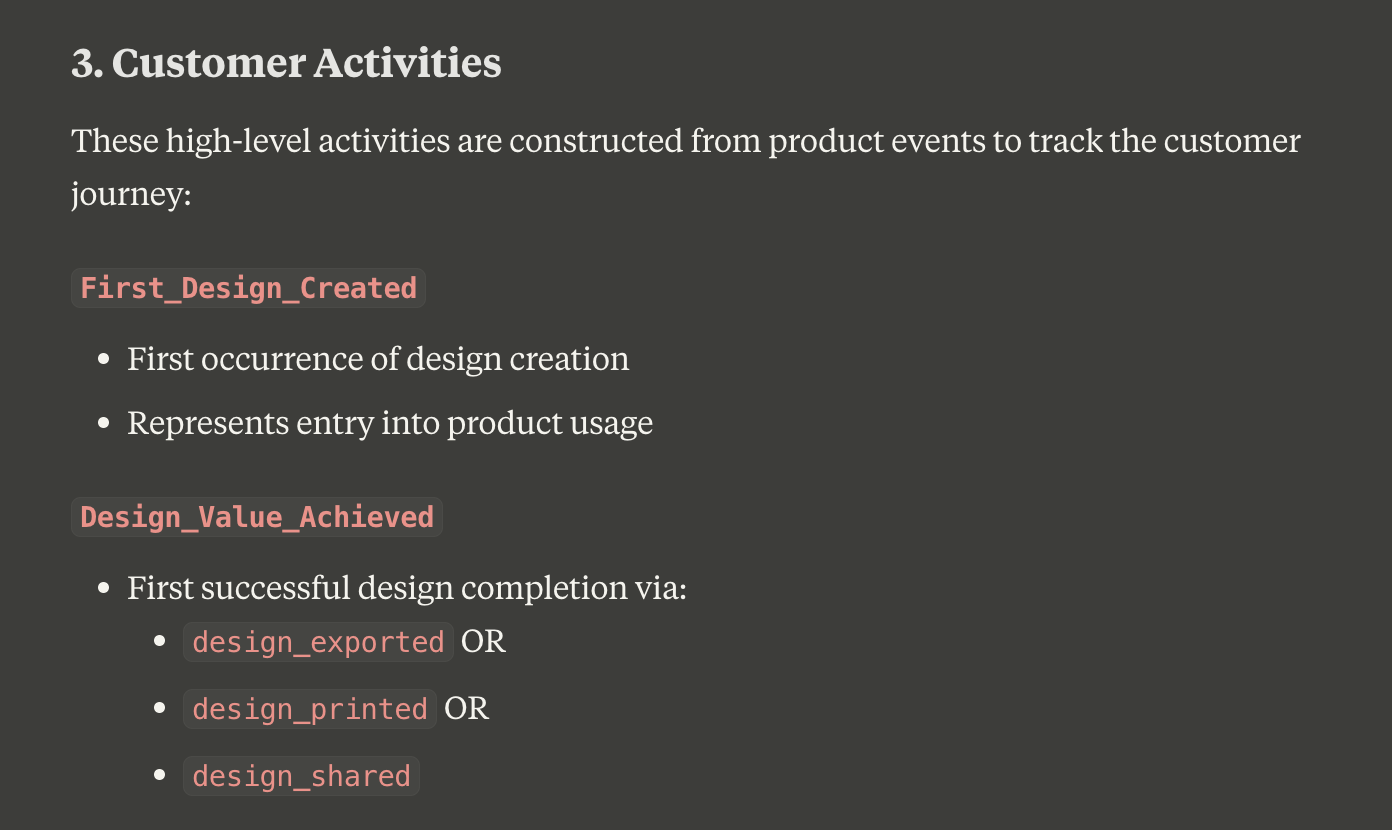 Once you’ve identified your success moments, the next step is turning them into metrics that can drive product decisions. In Canva’s case, we can combine our success events (export, share, print) into what I call “design value achieved” - a key metric that tells us when users are getting real value from the product.