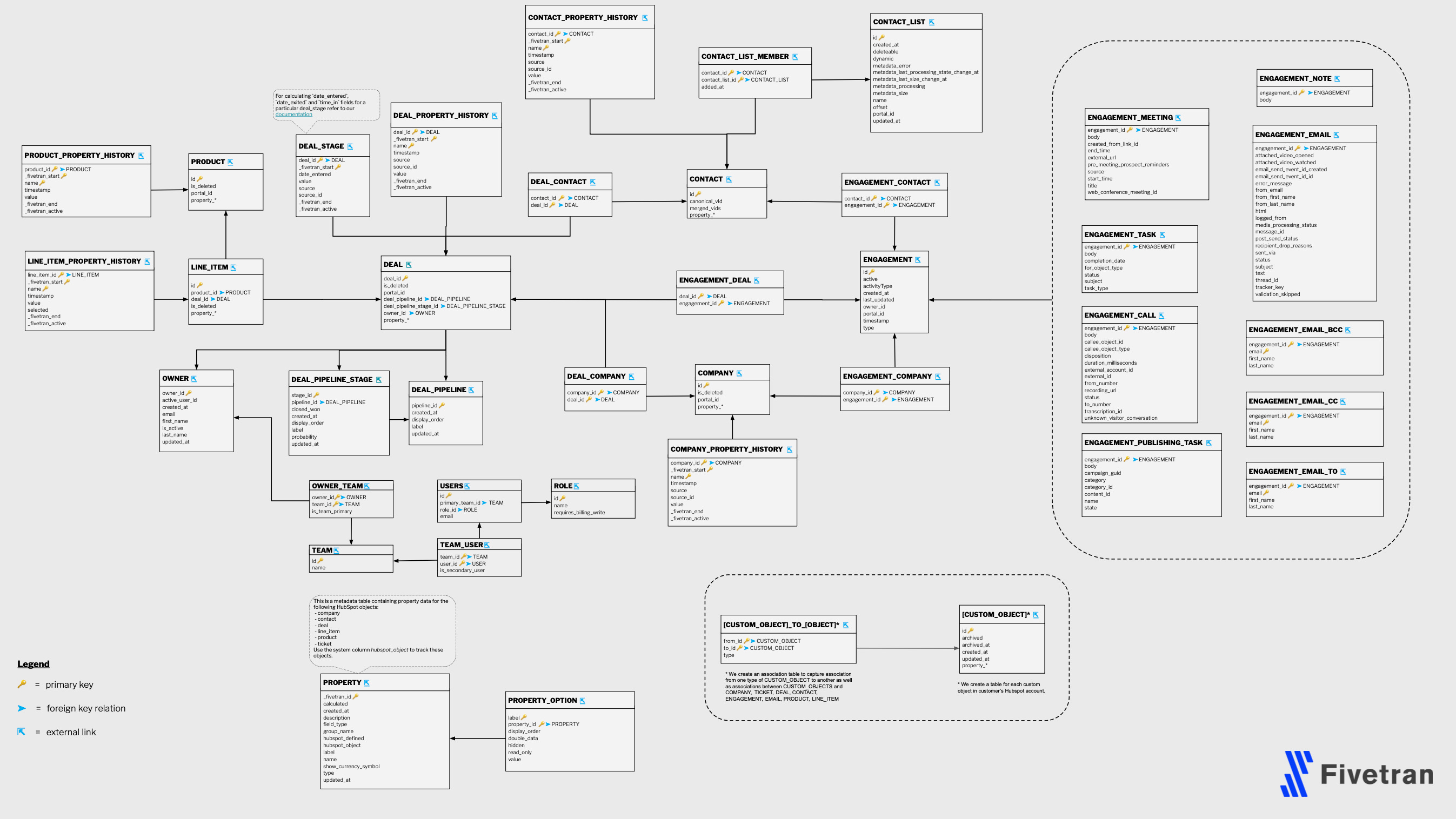 The Deals table is definitely interesting. It can be mapped back to a contact. And give us insights into the contact and deal journey. We again have the deal property history table, which can give us insights into the “deal created” event and potential other candidates.