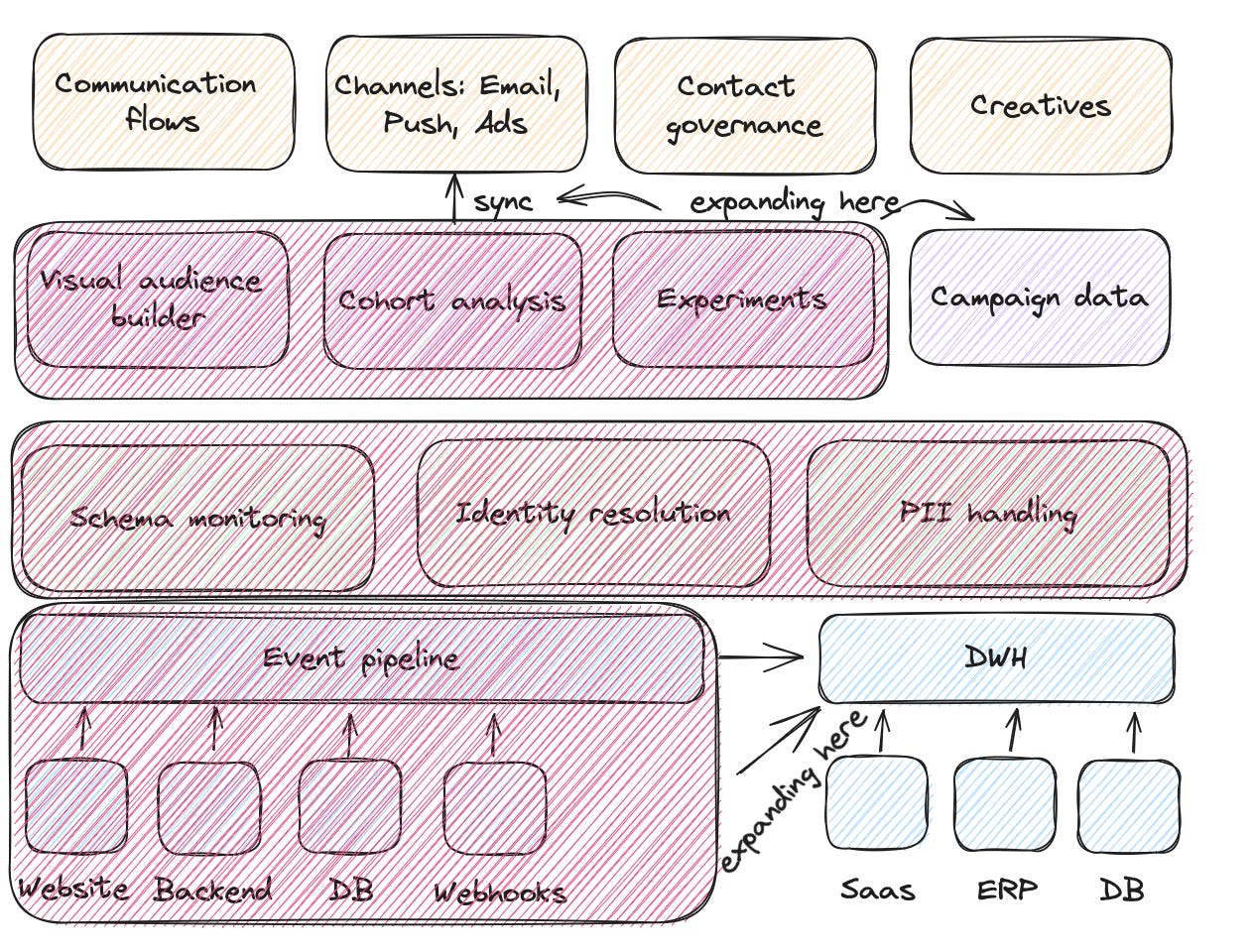 Another example is customer.io, which started with email, added segmentation, then added communication flows which could also trigger things at other platforms, and now introduced event pipelines to become a CDP.