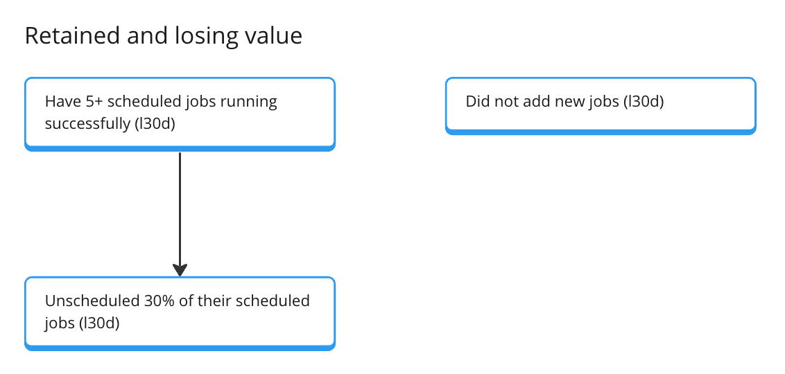 Have 5+ scheduled jobs running successfully (for l30d) - this can already become our “returning value” state. People who successfully run many scheduled jobs get value from the platform.