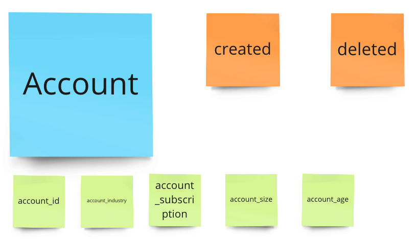But I like to show an alternative way here. Not a big surprise to you if you have read other posts by me; I will do this by using event data. We will pick each metric and break down which entity + activity = event we would need to measure the metric and also look a tiny bit into which properties, aka dimensions, could also be helpful for us.