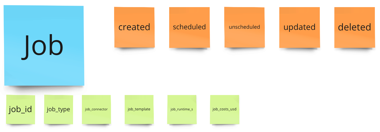 But the most crucial property is job_runtime, which we need to calculate the seconds used. And we also need the costs of a job for our clients -> job_costs. This might be something that we enrich later since these calculations are often batch jobs (to incorporate these crazy discounts that sales teams love to negotiate). To enable a later enrichment, we need “job_id”.