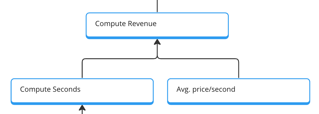 The computed revenue is built up by the computed seconds and the average price per second. The avg. price per second will be calculated by the total compute revenue divided by the total compute seconds in this month. The revenue for each compute run can be added as a dimensional value and then used for sum aggregation.
