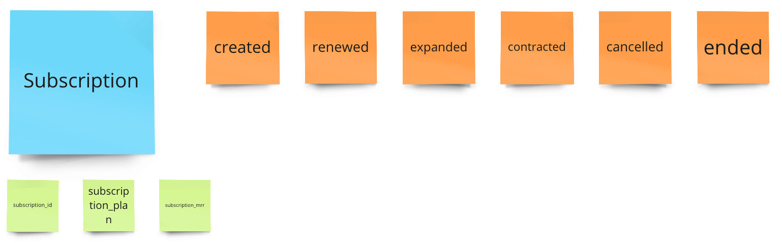 We need “subscription created”, “subscription renewed”, “subscription cancelled”, “subscription expanded”, “subscription contracted” and “subscription ended”.