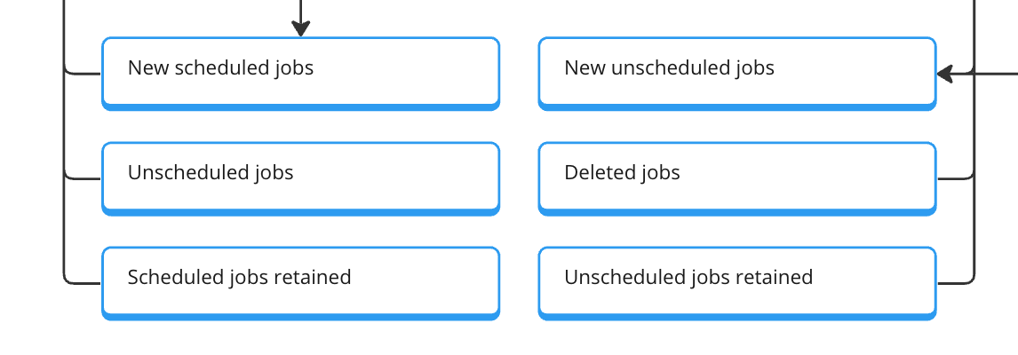 We need “job created” for new jobs and “job deleted”. Additionally, we need “job scheduled” and “job unscheduled”—the retained metric we can calculate based on these.