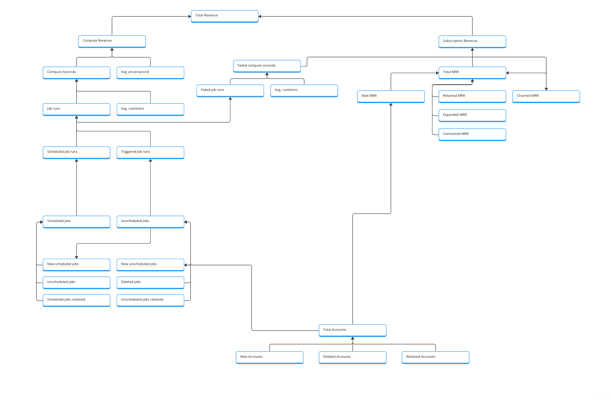 I don’t explicitly handle free job runs in my initial metric tree. Offering free runs or seconds for runs before you get charged is pretty common. As a first implementation, I would cover the free tier as dimensional values. So, a job executed can have a billable dimension to indicate if it was billable or free. But a v2 could also explicitly map the free-run metrics.