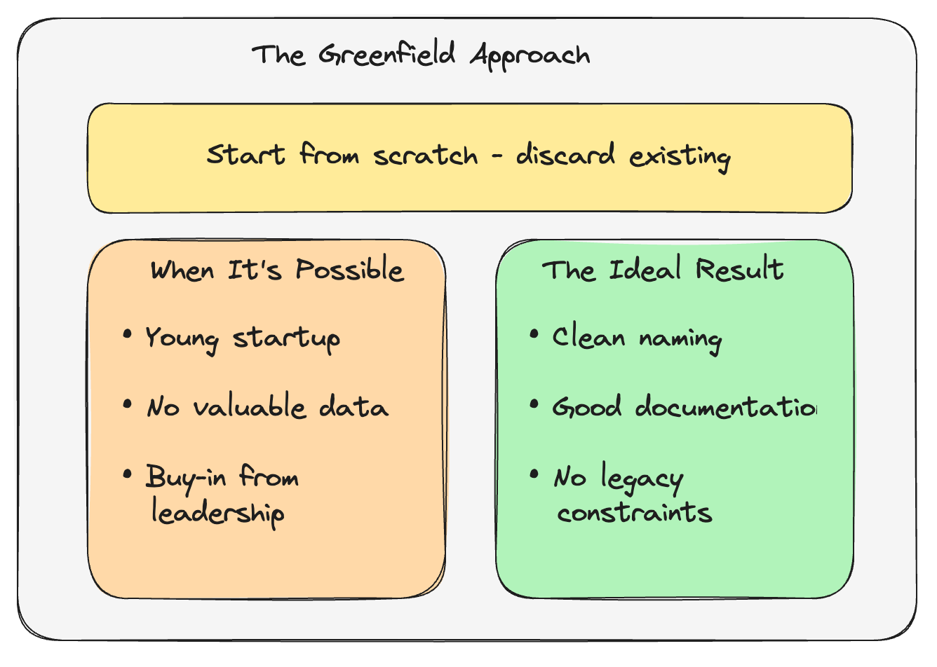 The Greenfield strategy is quite a rare approach, typically occurring in specific circumstances. It’s most common when working with young organizations or startups that already have a temporary setup in place.