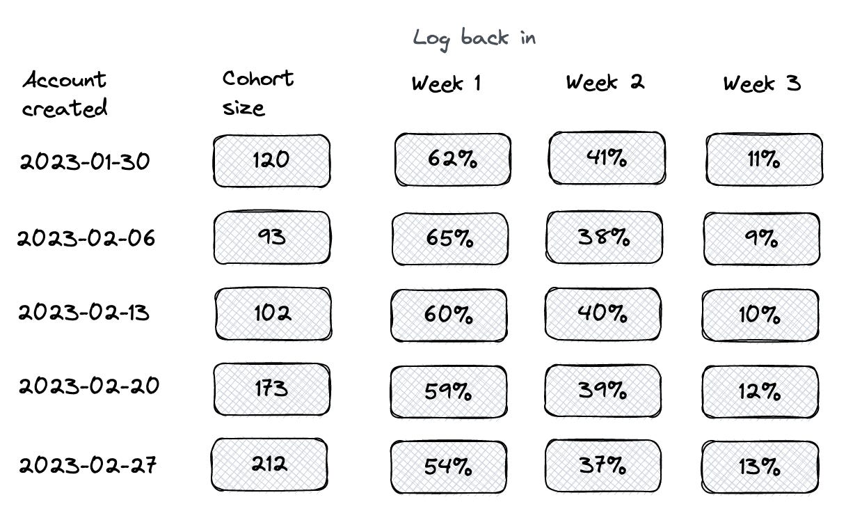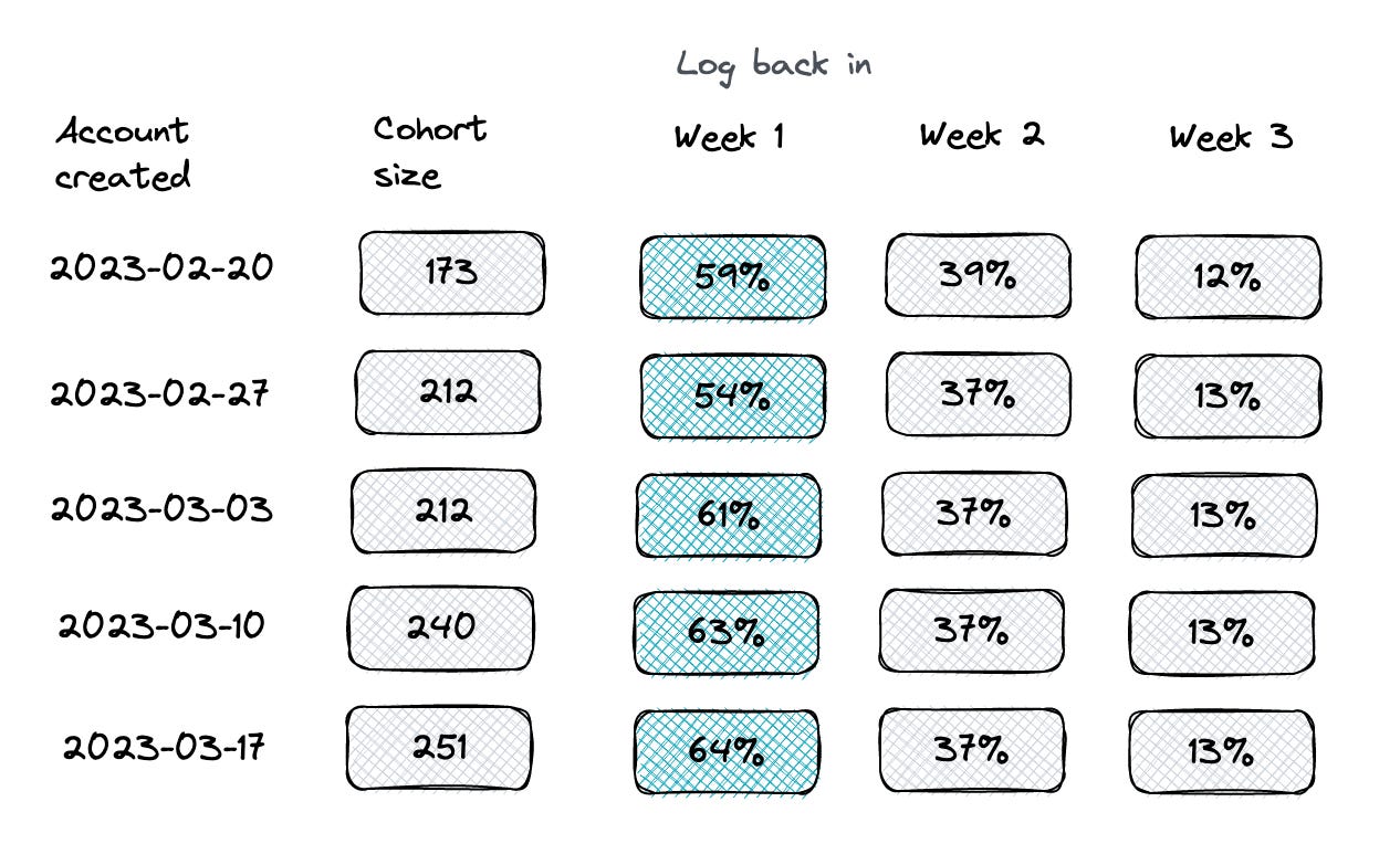 All the cohorts are in the left column and contain all users that have signed up for this specific week. The coming back percentage is the number of users logging in divided by all users in the cohort on a weekly base (in the next seven days and so on).