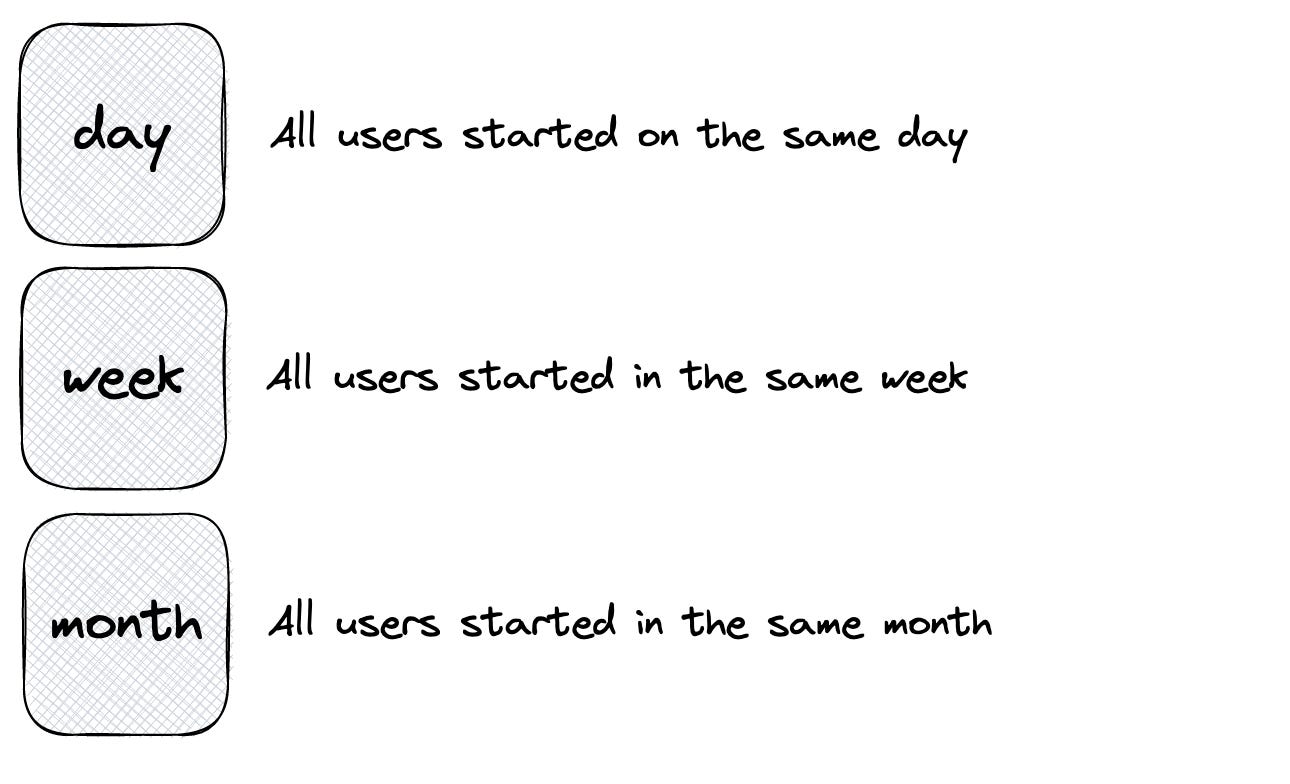 Then define which period makes the most sense for these. Ideally, you can do this based on when you expect the users to return. In most products, this is on a weekly basis, and for subscription retention, it is most often on a monthly basis.