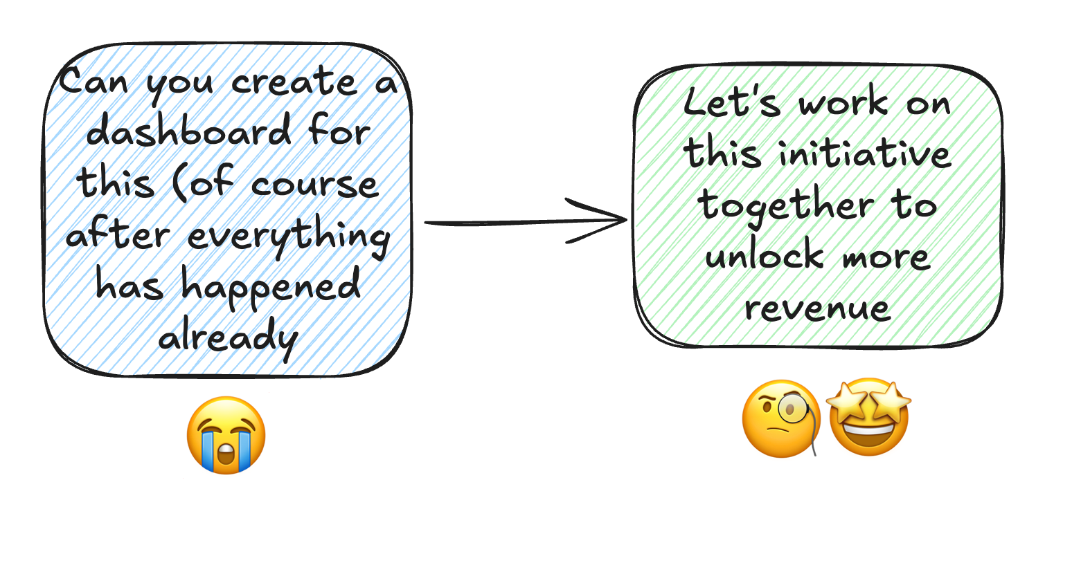 First, let’s look at purpose. We just achieved data product-market fit - people are asking questions. We don’t want to shut them down immediately by saying “great question, we can’t answer, next please.” But saying yes and taking six weeks is basically doing the same thing in a passive-aggressive way. We need to be proactive.
