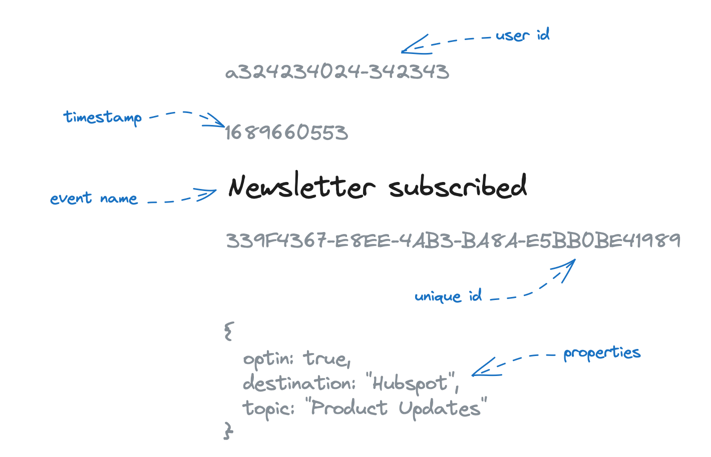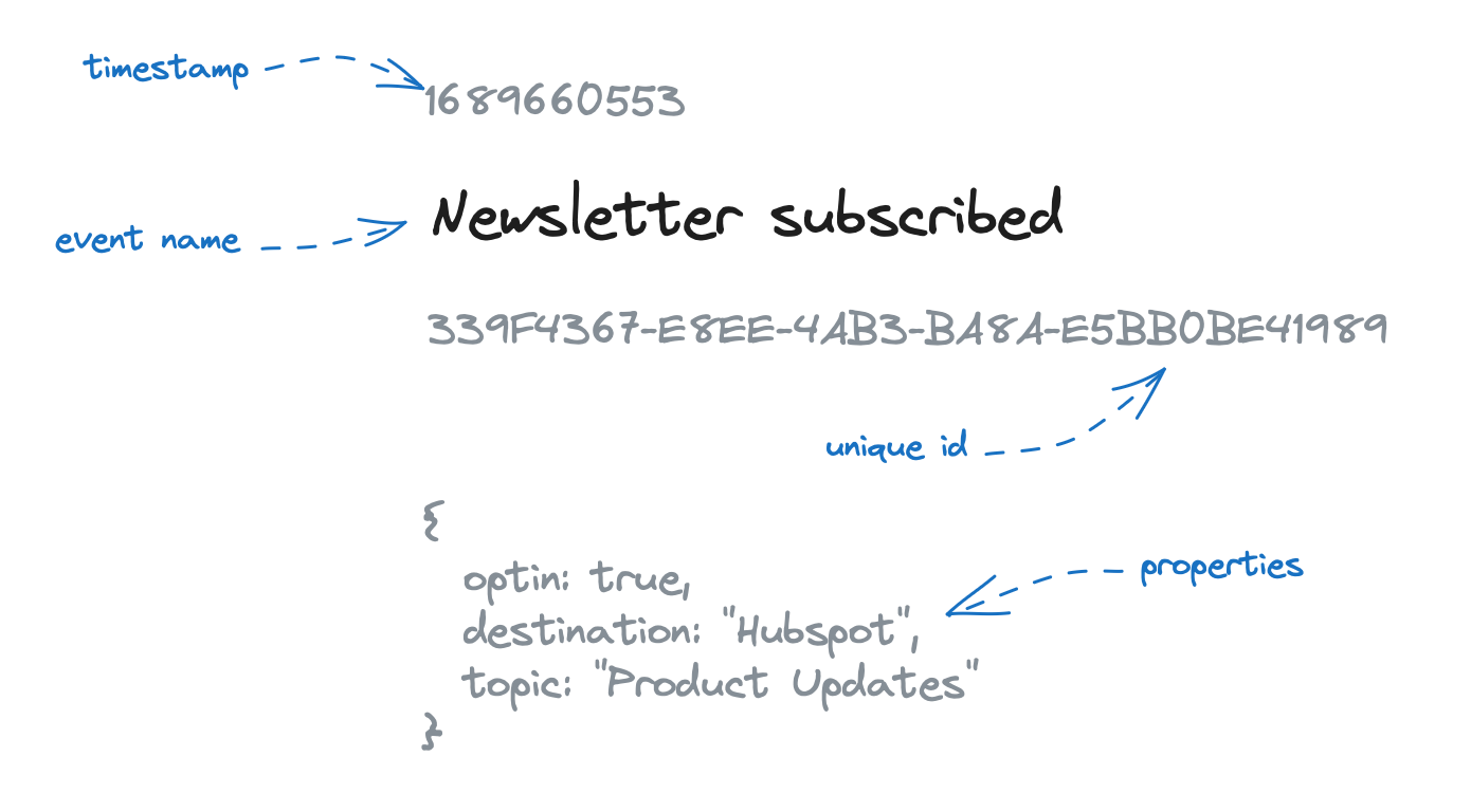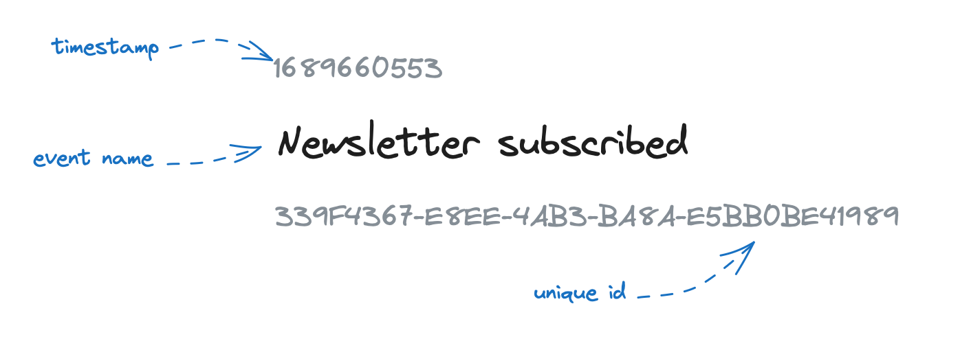 It’s quite impossible to name an event that would answer all these context questions. Maybe “Newsletter double opt-in saved” would be technically more precise. But have fun letting business teams work with that. We pick this problem up in the next paragraph.