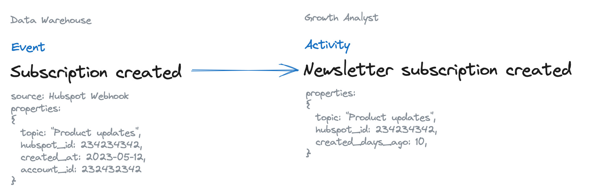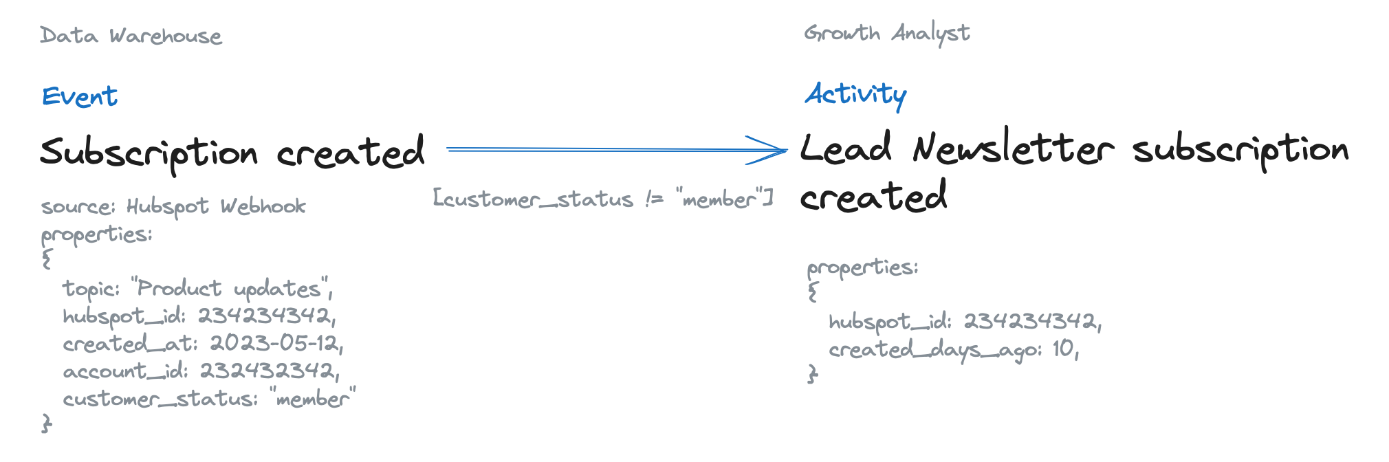 Let’s retake our example. An activity could be “Newsletter subscription created.” This is an activity that is important for the growth team. We now have different technical events where we can decide which defines this activity. We choose the webhook event “Subscription created” from our CRM. This mapping gets into our activity layer definition (we get to that in a second); therefore, it is easy to check for everyone if you want to know where the data for this event is coming from.