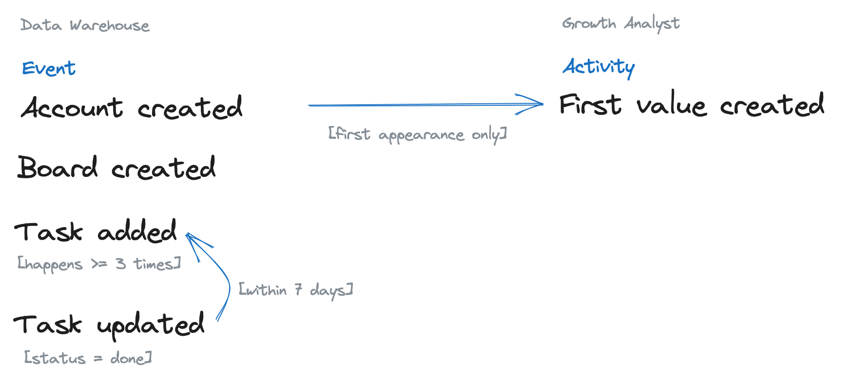 We can even use sequences of events for the definition of one activity. Something we already know from product analytics tools like Amplitude or Mixpanel. Let’s take an activity, “First value generated,” which can combine different events indicating that users got their first value from a product.